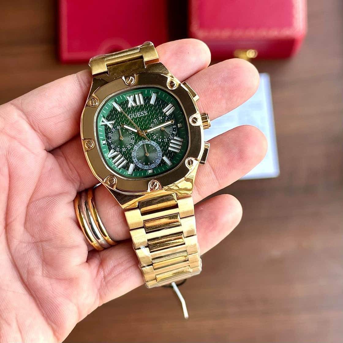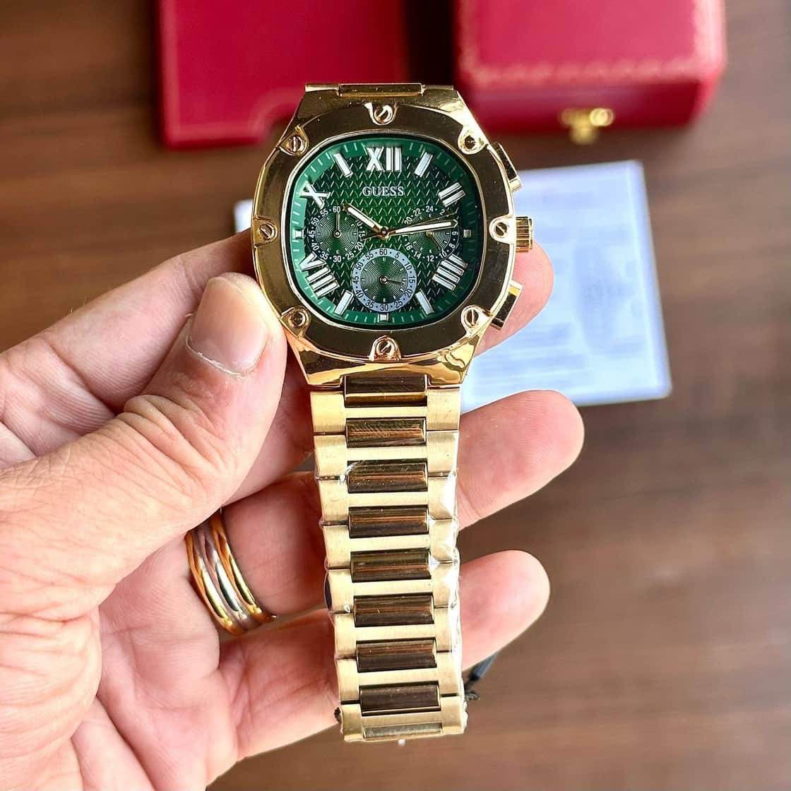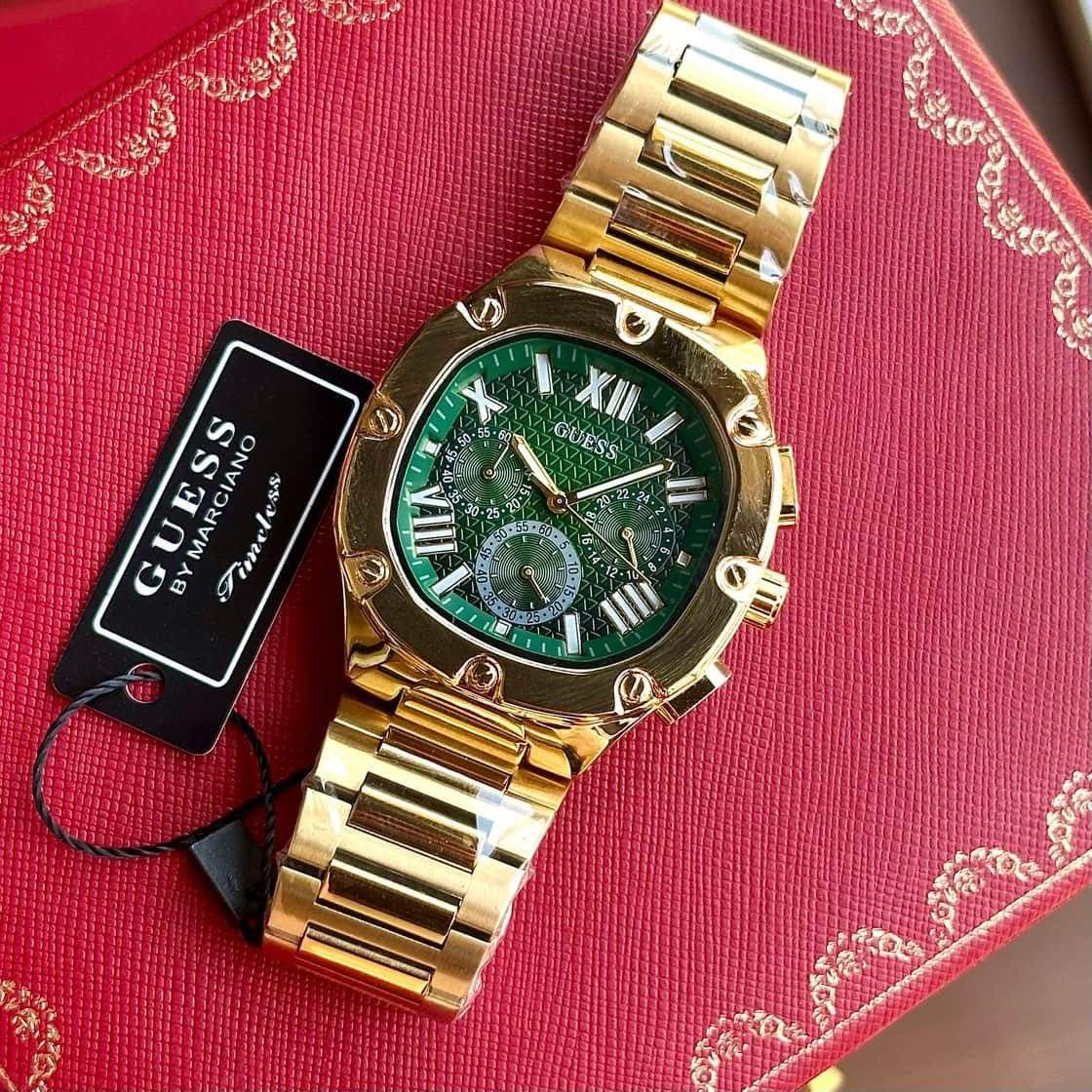 The Guess Chronograph watch for men is the perfect timepiece for the man who loves to be on time. Featuring a Golden Tone Chain and a Green analog dial, this Chronograph watch will keep you looking sharp while also keeping you on schedule.